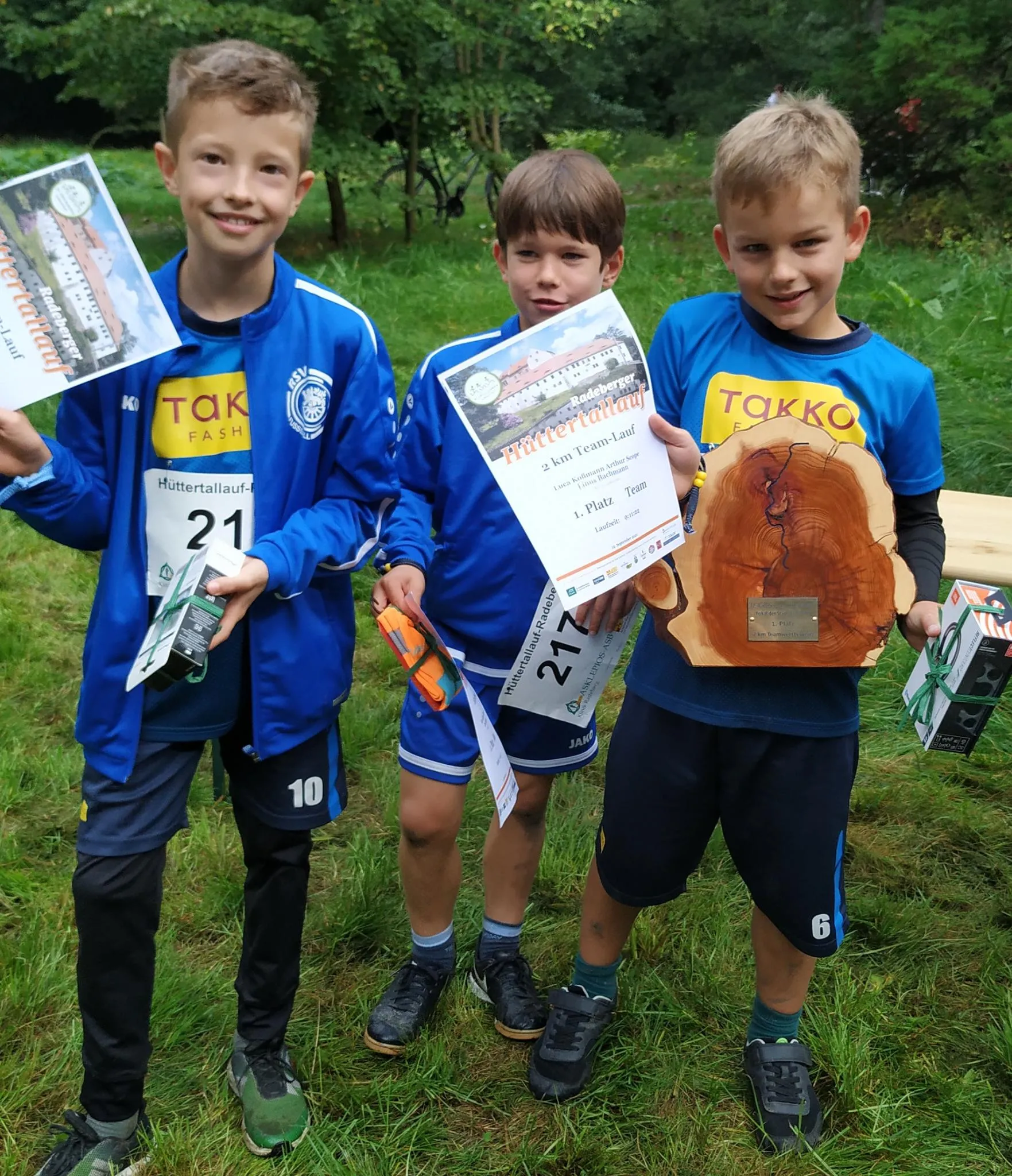 Auch möglich Am nächsten Tag, dem Sonntagmorgen, spielten Fußbälle eine Nebenrolle bei unserer E2. Es hieß bei hoher Luftfeuchte: Laufen in 3er-Teams beim Hüttertallauf (http://rc1898radeberg.de/huettertallauf/) - ganz ohne Ball. Mit Erfolg und viel Spaß rannten unsere Spieler nach einer gemeinsamen Erwärmung die Strecke von 2 km: Platz 1, 3 und 4. Wow! Auch die drei Eltern und der Trainer sprinteten mit Vorbild die längere 10 km Runde: Platz 2, 11, 57 und 58. Und noch vor der Siegerehrung kamen bei den Kindern Stimmen auf: Machen wir nächstes Jahr wieder mit? Aber gern. Wir danken insbesondere Herrn John Scheller (EDEKA) für die finanzielle Unterstützung zur Anmeldung beim Hüttertallaufs, bei Benny und Nicole für die Umsorgung sowie allen Eltern für die Motivationsschübe beim Zieleinlauf.
